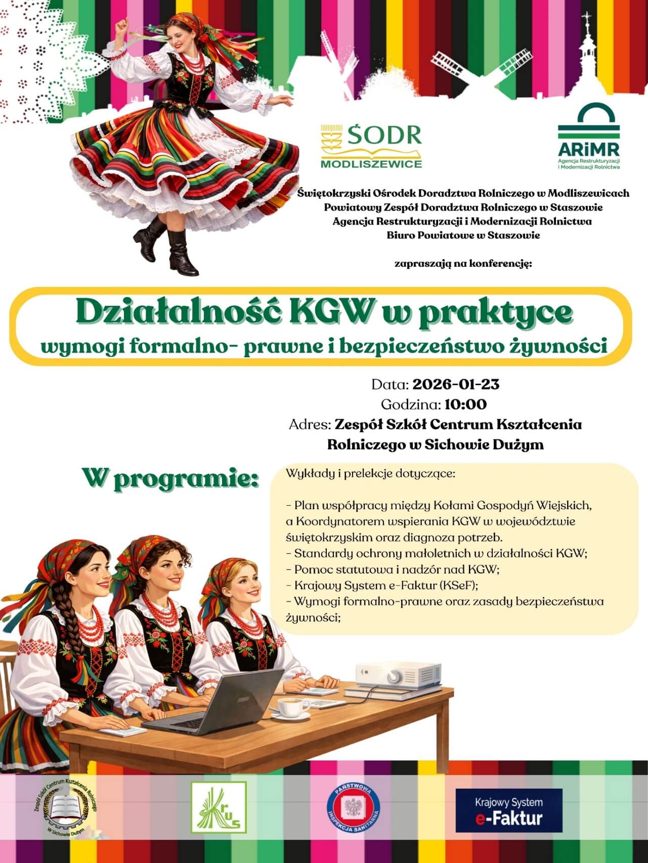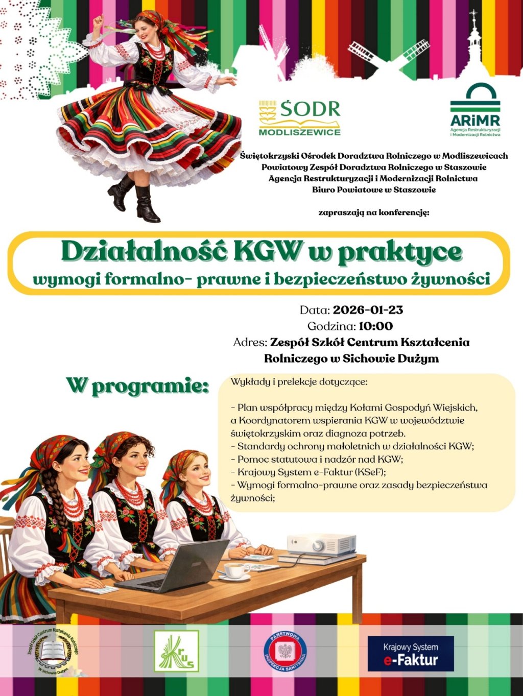 Kierownik Biura Powiatowego ARiMR w Staszowie oraz Kierownik Powiatowego Zespołu Doradztwa Rolniczego w Staszowie zapraszają serdecznie przedstawicieli wszystkich Kół Gospodyń Wiejskich z terenu Powiatu Staszowskiego na konferencję pt.:„Działalność KGW w praktyce, wymogi formalno – prawne i bezpieczeństwo żywności” organizowaną w dniu 23 stycznia 2026 roku w auli Zespołu Szkół Kształcenia Rolniczego w Sichowie Dużym.