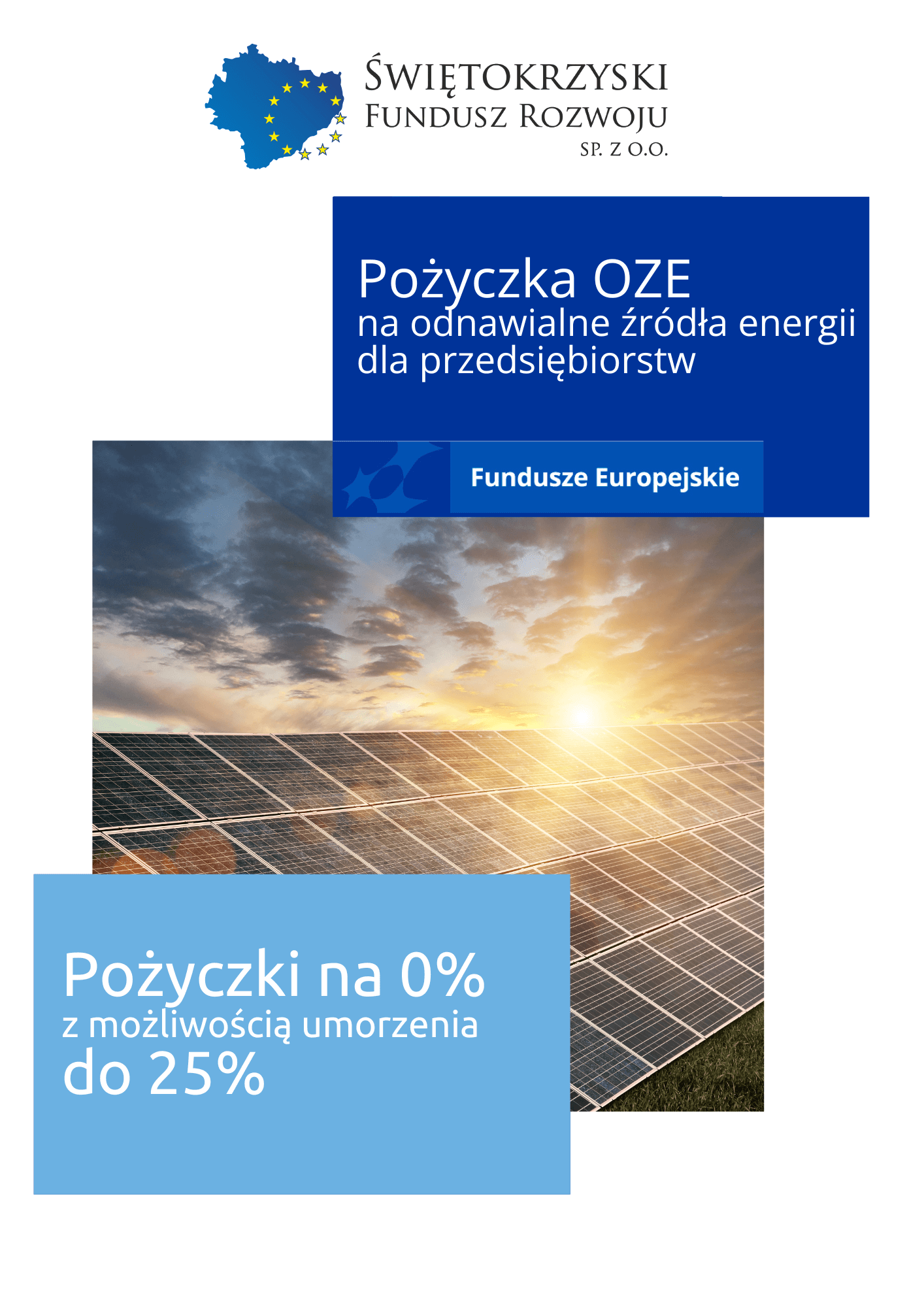 Pożyczki na OZE dla przedsiębiorstw są realizowane w ramach Funduszu Powierniczego Województwa Świętokrzyskiego. Całkowity budżet projektu wynosi 35 mln zł, z czego 29,75 mln zł pochodzi z Europejskiego Funduszu Rozwoju Regionalnego, 5,25 mln zł z Funduszu Powierniczego KW_FP, a dodatkowo 1,84 mln zł stanowi wkład własny Świętokrzyskiego Funduszu Rozwoju Sp. z o.o. Instrument jest wdrażany przez Świętokrzyski Fundusz Rozwoju Sp. z o.o. we współpracy z Bankiem Gospodarstwa Krajowego (BGK). Projekt realizowany jest w ramach programu Fundusze Europejskie dla Świętokrzyskiego 2021-2027 i potrwa 18 miesięcy.