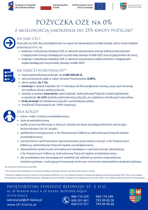 Pożyczka na OZE dla przedsiębiorstw to doskonała okazja na inwestycje w zieloną energię, obniżenie kosztów działalności i wsparcie transformacji energetycznej w regionie. Więcej informacji można uzyskać na stronie Świętokrzyskiego Funduszu Rozwoju Sp. z o.o. www.sfr-kielce.pl